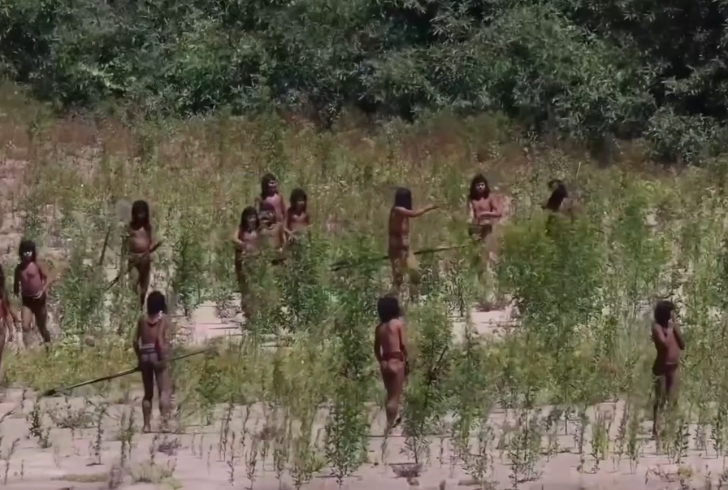 The footage shows members of an uncontacted Indigenous group cautiously approaching outsiders along a riverbank. At first, the group remains armed, moving in a tight formation and studying every detail in front of them. A canoe carrying food serves as the turning point. As it becomes clear no harm is intended, the tribe slowly lowers its weapons.